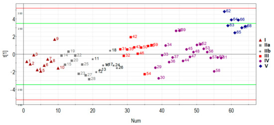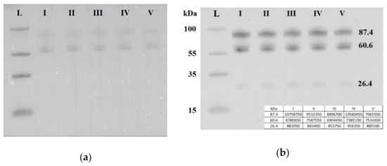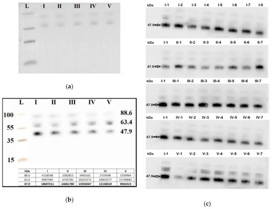 Seven blood plasma samples from each of the groups I–V were taken into analysis. To take into account the efficiency of protein transfer from PAAG/SDS to the PVDF membrane, the binding of primary and secondary antibodies, exposure in the analysis of chemiluminescence, the same sample (number 1 from group I, I-1) was applied to each PAAG/SDS to normalize all studied samples (Figure 6c).