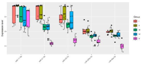 Pairwise comparison of groups II–V to group I by the miRNA ΔCt value for an optimized cohort of patients.