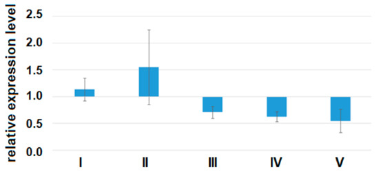 Thus, in our study, 12 miRNAs were analyzed in 64 blood plasma samples from pregnant women from groups I–V (Table 1) by a quantitative real-time RT-PCR method using a sense primer specific for miRNA (Table 2) and a universal antisense primer from the miScript SYBR Green PCR kit. For data normalization, the use of miRNAs as normalizer seems to be more appropriate than other small noncoding RNAs such as RNU6, since this normalization strategy with the same family of RNA molecules comprises the same methods, such as extraction, reverse transcription, and PCR, and this conclusion is highlighted in the review article of Madadi S. et al. [46]. We found the expression level of hsa-miR-382-5p to be identical in all 64 analyzed samples except one (Figure 2). In this connection, the relative expression level of miRNAs in the blood plasma samples was determined by the ∆Ct method using hsa-miR-382-5p as the reference RNA.