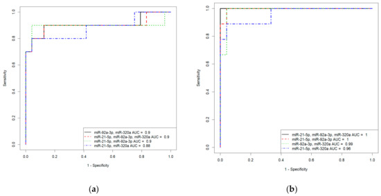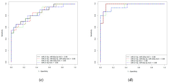 Based on the values of clusterin content and the expression levels of its potential regulators, miR-21-5p, miR-92a-3p, and miR-320a-3p, in the peripheral blood plasma, due to their highly significant correlations with the severity of AIP, logistic regression models were developed for calculating the probability of the presence of placenta accrete, increta, or percreta in a pregnant woman at 32–34 weeks of gestation. Based on the expression levels of miR-21-5p, miR-92a-3p, and miR-320a-3p, logistic regression models were developed for the entire cohort of patients, including pregnant women with unconfirmed MRI/ultrasound diagnoses of AIP during cesarean section and/or histological analysis (Table S2, Sheet 1: patients without AIP, n = 27; patients with placenta accreta, n = 10; patients with placenta increta, n = 20; patients with placenta percreta, n = 7), and for an optimized cohort of patients (Table S2, Sheet 2: patients without AIP, n = 24; patients with placenta accreta, n = 9; patients with placenta increta, n = 14; patients with placenta percreta, n = 7 ). It seemed interesting to find out whether the classification of samples by the presence or absence of AIP, based only on MRI/ultrasound data, affected the parameters of the developed logistic regression models. We found that the diagnostic accuracy of expression profiling of the combination of miR-21-5p, miR-92a-3p, and miR-320a-3p for the identification of placenta accreta was higher in the case of optimized cohort of patients (AUC = 1, p < 0.001; accuracy—100 %, sensitivity—100%, specificity—100%, true positive rate—1; false positive rate—0) compared to that of the case of entire cohort of patients (AUC = 0.9, p < 0.001; accuracy—88.2 %, sensitivity—90%, specificity—95.8%, true positive rate—0.9; false positive rate—0.125). Similarly, the diagnostic accuracy of expression profiling of the combination of miR-21-5p, miR-92a-3p, and miR-320a-3p for the identification of placenta increta was significantly higher in case of optimized cohort of patients (AUC = 0.981, p < 0.001; accuracy—94.9 %, sensitivity—100%, specificity—91.6%, true positive rate—1; false positive rate—0.0833) compared to that in case of entire cohort of patients (AUC = 0.848, p < 0.001; accuracy—80.9 %, sensitivity—75%, specificity—92.5%, true positive rate—0.55; false positive rate—0). Receiver operating characteristic (ROC) curves of the developed logistic regression models in cases of entire and optimized cohorts of patients are presented in Figure 8. The diagnostic accuracy of expression profiling of each of miR-21-5p, miR-92a-3p, miR-320a-3p for the identification of placenta percreta was the same for the two cohorts of patients (Table S1, Sheet 1 and Sheet 2: AUC = 1, p < 0.001; accuracy—100 %, sensitivity—100%, specificity—100%, true positive rate—1; false positive rate—0).