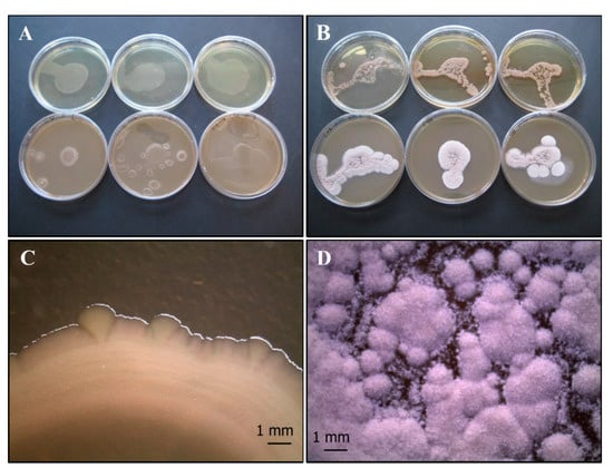 P. fluorescens (Pf) forms small, low convex, colorless colonies, although white-cream pigmentation is frequent [49] (Figure 1A,C), while S. vinaceus (Sv) forms slow-growing, circular, convex, and rough colonies (Figure 1B,D). This latter bacterium is characterized by a macroscopic mycelium morphology including pellets and clump formation [50].
