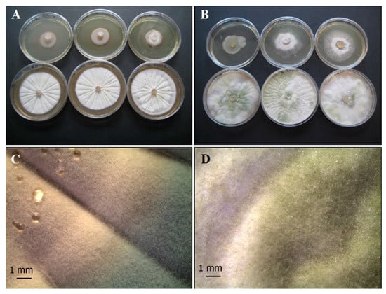 T. harzianum group (Th) isolates (Figure 2B,D) produce typical rough and globose to subglobose conidia and their color was yellow or green [52,53,54]; conidia production is greater in the middle of the plate with respect to the margins.