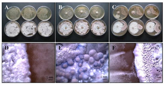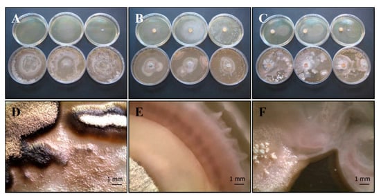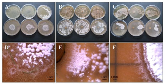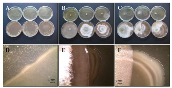 Growth of T. harzianum Serp05S and P. fluorescens complex SERP1 (Th-Pf mix) in co-growth tests on TSA (upper row of plates, A–C, respectively) and on CYA (lower row of plates, A–C, respectively). Method of inoculum: (A) agar overlay, (B) agar plug, (C) distance growth. Stereo Microscope details of colony shape when grown in mix (D–F). In the agar overlay method the fungus does not thrive where the bacterium was inoculated (D). In the distance growth method, Th growth is disturbed and confined in its half of the plate (C,F). N = 30 each test.