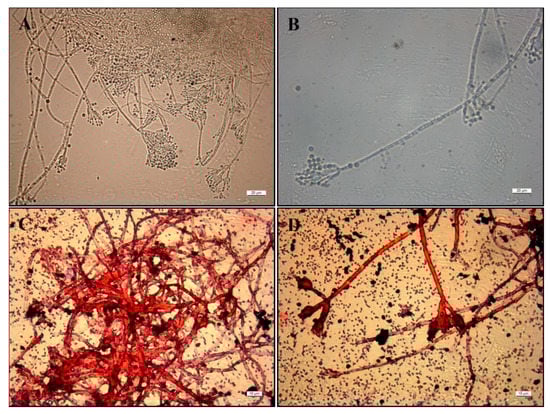 In-depth observation of the best co-grown bacterium and fungus mix (Po-Pf mix) under the optical microscope (Figure 7A,B) shows the typical fungal conidiophore branching patterns mostly symmetrical and mono- and biverticillated [55]. The Gram staining underlines the Gram-negative bacterium P. fluorescens complex, counter-stained pink by safranin (Figure 7C,D). However, the conidiophores of P. ochrochloron are also clearly stained with a bright red color.