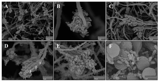 The backscattered (BSE) SEM imaging of the best co-grown bacterium and fungus mix (Po-Pf mix) highlights clusters of fungal hyphae enveloped by groups of flagellate Pf (Figure 8A,B). Conidiophores are often covered on the tip by bacterial colonies adhering by means of adhesive filaments that provide a compact structure to bacterial biofilm consisting of live and dead cells (Figure 8C,D). Fungal spherical conidia are still borne (Figure 8E) or free (Figure 8F) on specialized stalks of the conidiophore that is characterized by typical vial-shaped cell (i.e., phialide), as shown in Figure 8D.