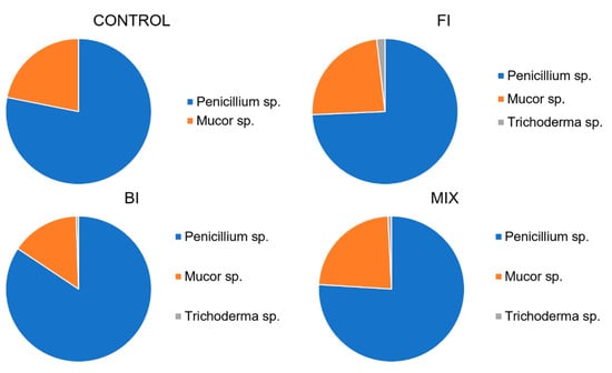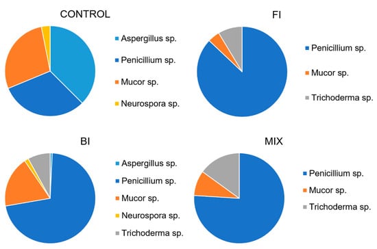 Twelve months after the inoculation, three different fungal morphotypes were identified in the plates. The fungal abundance was homogenized in the samples, but the Penicillium cfr. ochrochloron was the most represented species, followed by Mucor sp. and Trichoderma sp. No Aspergillus sp. and Neurospora sp. strains were isolated from the plates. The abundance of each morphotype is reported in Figure 10.