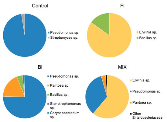 It is interesting to note that the dominant bacterial strain in FI (~85%) is Erwinia sp., while the Pseudomonadaceae are dominant in control (97.5%).
