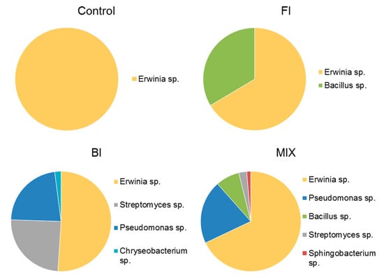 After twelve months, although there are no significant differences on the isolated morphotypes, Pseudomonas sp. it is no longer the most abundant genus in BI (−22%). In fact, Streptomyces sp. (−24%) and Erwinia sp. thrive in all types of treated soils. In fact, the pie chart in Figure 12 shows that Erwinia sp. represents half of the bacterial colonies isolated in BI, 66% and 68% in FI and MIX respectively and even represents the monospecific community in control.