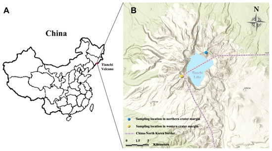 Location of Tianchi Volcano in China (A) and sampling area in northern and western margin of Tianchi crater (B). The map was generated from ArcGIS Online (https://maps.arcgis.com/index.html, accessed on 1 January 2021) [34].
