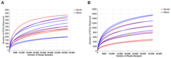 Rarefaction curve of fungal OTUs (A) and bacterial OTUs (B) for α-diversity analyses.