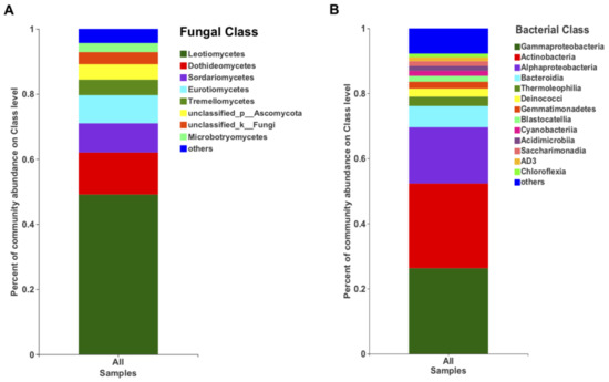 The relative abundance of fungi (A) and bacteria (B) at class level.