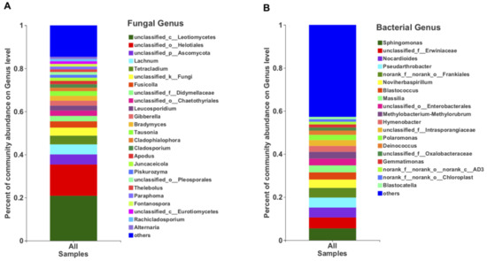 The relative abundance of fungi (A) and bacteria (B) at genus level.
