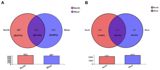 The Venn diagram displaying the distribution of shared and unique OTUs of the fungal community (A) and bacterial community (B) in two sides of the crater. The number of OTUs in each side is indicated in the respective circle.
