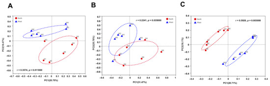 The variations of fungal and bacterial OTUs were analyzed by principal co-ordinate analysis (PCoA). Fungal communities in northern and western crater soil were clearly distinguished based on Bray–Curtis distance (ANOSIM p = 0.011) (Figure 7A), weighted Unifrac distance (ANOSIM p = 0.035) and unweighted Unifrac distance (ANOSIM p = 0.003) (Figure 7B,C). The separation of communities was more significant using unweighted Unifrac distance, which is more sensitive to taxa presence or absence regardless of their abundances compared with Bray–Curtis distance and weighted Unifrac distance. For bacterial communities, on the contrary, no clear separation was found based on the different dissimilarity matrices (Figure 8).