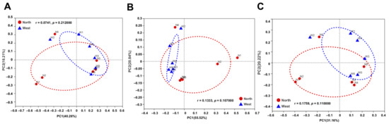 Principal co-ordinate analysis (PCoA) plots of bacterial communities in northern and western crater soil based on Bray–Curtis distance (A), weighted Unifrac distance (B) and unweighted Unifrac distance (C). The r and p-values of analysis of similarity (ANOSIM) were shown respectively in each figure (p > 0.05).