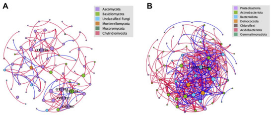 Soil OTUs network analysis in the Tianchi crater soil (Fruchterman Reingold layout). (A) Network of fungal community; (B) network of bacterial community. Each node represents an OTU indicating an individual species. Color codes for nodes belonging to different dominant phyla. The node size is proportional to the degree (degree = number of direct correlations to a node). Positive interactions are displayed as red edges and negative interactions are displayed as blue edges.