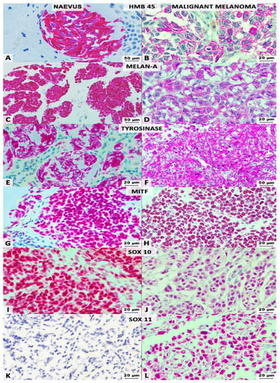 Immunohistochemical profile of naevi (left columns) vs. malignant melanomas (right columns), highlighted with Red Magenta Substrate Chromogen. HMB-45 can mark both naevi (A) and melanoma cells (B), same as melan-A (C,D), tyrosinase (E,F), microphthalmia transcription factor (MITF) (G,H) and SOX10 (I,J). No immunoreactivity is observed for SOX11 in naevi (K), but melanomas can present nuclear stain (L).