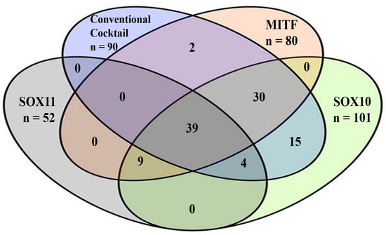 In skin cutaneous melanomas, the Venn diagram shows interaction between conventional pan-melanoma cocktail (triple positivity for HMB-45/melan-A/tyrosinase), SOX11, SOX10, and MITF.