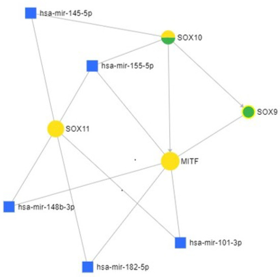 SOX11 SOX10, and MITF gene interaction generated using miRNET emphasizes direct interaction with miR-101-3p and miR-145-5p. Figure legend: Yellow circle: Gene; green circle: Transcription factor (TF); and blue square: miRNA.
