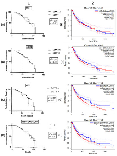 In the present cohort (1), univariate Kaplan–Meier survival analysis did not sustain the independent prognostic value of (A) SOX11, (B) SOX10, (C) MITF, or (D) co-expression of SOX11, SOX10, and MITF. In cutaneous melanomas, the TCGA dataset, which was examined using GEPIA (2), also inform the independent prognostic value of these factors (E) SOX11, (F) SOX10 and (H) co-expression of SOX11, SOX10, and MITF, except the (G) MITF gene signature.
