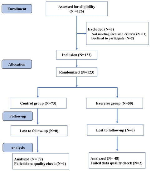 This randomized control trial was based on a two × two mixed factorial design and used group (exercise vs. controls) as a between-subject factor and time (post-exercise vs. pre-exercise) as a within-subject factor (repeated measures). The experiment was conducted at Yangzhou in China, with ethics approval from the Ethics and Human Protection Committee of the Affiliated Hospital of Yangzhou University (2017-YKL045-01). All study procedures were in accordance with the latest version of the Declaration of Helsinki.
