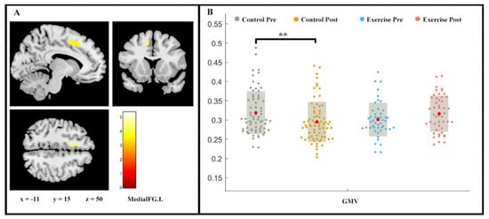 Volume changes in grey matter during 9 weeks of exercise intervention. Note. (A) Significant (p < 0.05, FDR-corrected) longitudinal grey matter volume increases; (B) grey matter volume (GMV) in medial FG.L for two groups at pre- and post-exercise. x, y, z = coordinates in MNI space. ** means p < 0.01.