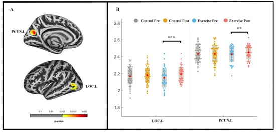Cortical thickness changes during 9 weeks of exercise intervention. Note. (A) Significant (pvertex < 0.001 uncorrected, pcluster < 0.05, FWE-corrected) longitudinal cortical thickness increases; (B) cortical thickness in left lateral occipital cortex (LOC.L) and the left precuneus (PCUN.L) for two groups at pre-and post-exercise. ** means p < 0.01,*** means p < 0.001.