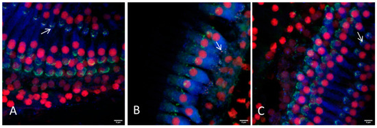Representative images of the hair cell ribbon synapses of inner and outer hair cells with preparation method III (dissection in three parts) using a 20× or a 63× objective. (A) Picture showing the apical region, where a distinction between inner and outer hair cells is not always possible due to overlapping of the cells. (B) Picture showing the inner hair cells and (C) the outer hair cells of the middle turn. (D,E) Inner and outer hair cells of the basal region are illustrated, respectively. Hair cells are labeled for myosin VIIa (blue), presynaptic ribbons for CtBP2 (red), and the postsynaptic density is labeled green. Arrows indicate intact ribbon synapses, where the staining of the presynaptic ribbon and the postsynaptic density are overlapping. Scale bars indicate 5 μm.