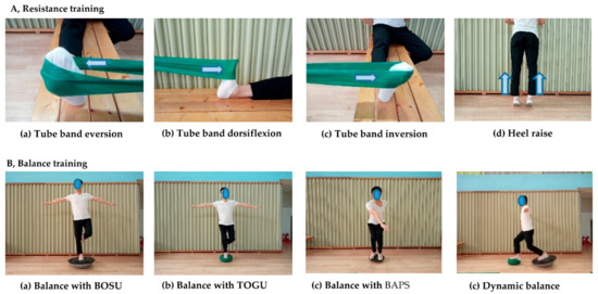 Patients with ankle sprains often require rehabilitation training. Typical symptoms after ankle injury include muscle weakness and loss of neuromuscular function; therefore, rehabilitation exercises are primarily focused on restoring strength and neuromuscular recovery [6,7]. In general, resistance training (RT), which is referred to as strength training, is primarily designed to strengthen the lateral side of the ankle, including the peroneal muscle [7]. Moreover, balance training (BT) comprises training using various balance tools, such as the biomechanical ankle platform system (BAPS); BT is also termed as neuromuscular or proprioception training [8,9]. The positive effects of these rehabilitation approaches have been previously reported. Six weeks of RT by athletes with ankle instability significantly improved eversion and inversion strengths [10], whereas BT prevented ankle sprain by improving the ability to rapidly position the ankle joint in dynamic sports situations [11,12]. Additionally, BT reduced the risk of re-injury to 32% in young soccer and basketball players [13]. Plyometric exercises performed for 6 weeks improved ankle strength and functionality in athletes [14], and even 4 weeks of rehabilitation training enhanced postural control and lower extremity function [15].
