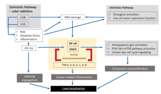Inflammatory signaling pathways connected with tumors consist of an intrinsic and extrinsic part. As presented in the previous part of the review, chronic inflammation leading to malignancy is induced by the production of oxidative stress in response to radiation such as UVR, mechanical and chemical factors, or pathogens. These factor-promoting conditions, which increase the risk of cancer, constitute the extrinsic pathway. Skin exposure to various provocative agents induces the infiltration of neutrophils, which are key producers of reactive nitrogen species and ROS involved in all phases of carcinogenesis. Elevated levels of ROS can activate nuclear factor kappa B (NF-κB), phosphoinositide 3-kinase/Akt8 virus oncogene cellular homolog (PI3K/Akt) pathways, activator protein-1 (AP-1), and extracellular signal-regulated kinase-/mitogen-activated protein kinase (ERK/MAPK).
