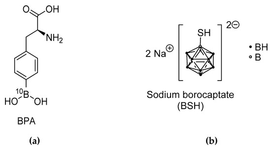 The two compounds currently used in clinical applications for BNCT (a) 10B-p-boronophenylalanine (BPA), (b) Sodium mercaptoundecahydro-closo-dodecaborate (BSH) [3].