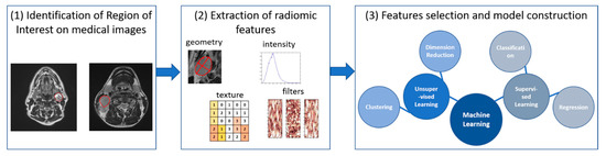 A recent development to obtain a quantitative description of the spatial organization of tissues is the so-called radiomics, i.e., the automated high-throughput extraction of large amounts of quantitative features of medical images [31] (Figure 2). Radiomics is now largely used in oncology, revealing high potential both for tumor diagnosis and response evaluation. In addition, radiomic features can be easily associated with quantitative image-based biomarkers from perfusion and diffusion imaging, to give an exhaustive multi-parametric characterization of tissues. In this way, structural and functional properties can be considered jointly to obtain more accurate prediction models [32].