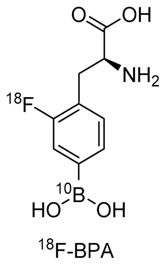 In this section we will focus on the use of Positron Emission Tomography (PET) as a diagnostic tool to determine the distribution of boron compounds in tissues for patient selection, treatment planning, and possible dose monitoring for BNCT using BPA as a 10B-compound. This drug was introduced to BNCT by Mishima in the late 1980s [37]. BPA is taken up by tumor tissues mainly by an l-type amino acid transporter (LAT-1) [38]. In 1991, Ishiwata et al. presented 4-10B-Borono-2-18F-fluoro-l-phenylalanine ([18F]FBPA) for monitoring the pharmacokinetics of BPA prior to BNCT [39] (Figure 3). Its use in in vivo pharmacokinetics and the quantification of BPA in patients were then performed by PET in the late 1990s by W. Kabalka et al. in the USA [40] and Y. Imahori et al. in Japan [41,42].