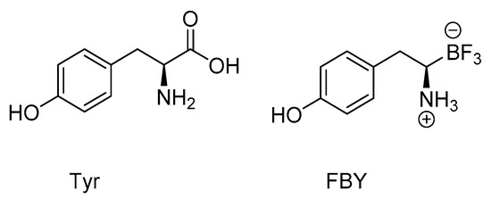 The radiolabeled compound [18F]FBPA (see paragraph 3) (Figure 3) is the most-used BNCT–PET theranostic drug [78]. Several other small molecules like [18F]FBPA can be used in this approach, such as the modified boron-derived tyrosine, fluoroboronotyrosine FBY (Figure 4), reported in 2019. FBY, a tyrosine analogue in which a COOH group is replaced by a BF3 moiety, was proposed as a theranostic agent [79]. FBY showed superior chemical stability compared with BPA, a high radiochemical yield of 50% and a high radiochemical purity of 98%. Its similarity with the natural amino acid tyrosine enables uptake via the LAT-1 system, and thus, accumulation of up to 128 µg FBY/106 cells. The possibility of non-invasive imaging was indicated by the administration of [18F]FBY to mice followed by PET imaging. Furthermore, FBY shows no obvious systemic toxicity, which renders this compound a very promising theranostic agent for image-guided BNCT [79]. A small preclinical study with six animals comparing BPA and FBY showed slightly better results for FBY in terms of animal survival and tumor size 3 weeks after BNCT with 1 g/kg intravenous injection of FBY and BPA and 30 min of 1012 n/(cm2 s) neutron flux. The tumor was placed in the right shoulder of the mouse. No kinetic data on FBY were presented [79].
