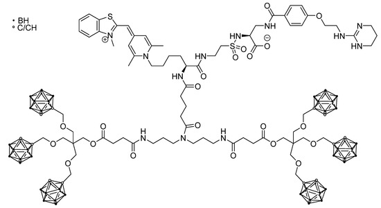 The research was focused on BSH (Figure 1), being highly desirable for BNCT compounds containing multiple boron atoms, which makes the delivery of 10B more efficient. However, this compound has a significant drawback as it is not able to easily cross the cell membrane directly, due to the negative charge of the boron cluster. To overcome this problem, an oligoarginine peptide was conjugated to a dendritic lysine bearing multiple BSH moieties. The structure containing eight BSH units was tested in vitro on U87 glioma cells in comparison with BSH alone and other BSH-CPPs conjugates showing an impressive uptake. Studies in vivo on the same U87 cells injected into the striatum of nude mice demonstrated that the compound accumulated into the tumor but was not detected in the normal brain [85].