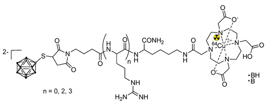 A BSH fused with a short oligoarginine domain was conjugated with 1,4,7,10-tetraazacyclododecane-1,4,7,10-tetraacetic acid (DOTA) and labeled with positron emitter 64Cu (Figure 6). Positron emission tomography was allowed to follow the pharmacokinetics of the compound in vivo in a U87δEGFR brain tumor bearing mice [53]. It is worth noting that this is the only example of a theranostic BNCT construct based on CPPs. To date, there are only a few examples of 18F labeling of CPPs [87], but none in the BNCT field.