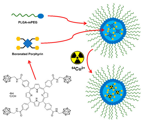 64Cu-containing boronated porphyrin incorporated into a biocompatible polymer nanoparticle [52]. The trefoil symbol at 64Cu indicates the radioactive element of this molecule.