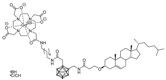 In other cases, nanoparticular entities were employed as the tumor-selective vehicle, like a biocompatible polymer nanoparticle carrying a boronated porphyrin complex with a 64Cu isotope [52] (for PET, Figure 7), or a liposome for a carborane-containing cholesterol derivative bearing a GdIII complex (for MRI, Figure 8) [96].