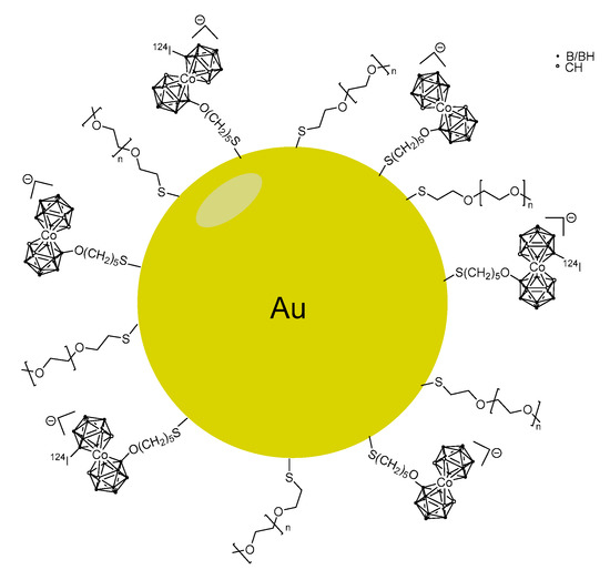 Gold nanoparticles (NP) coated with the boron-rich cobalt bis(dicarbollide) anion and stabilized with polyethylene glycol were synthesized (Figure 10) [49]. The NP were successfully labeled with 124I, on the NP surface and in the cobalt bis(dicarbollide) periphery (4.18 days half-life) for PET imaging. The incorporation in the mouse model of human fibrosarcoma (HT1080 cells) reached 0.06 mM, which is too low for BNCT. On the other hand, biodistribution studies in a xenograft mouse model of human fibrosarcoma showed major accumulation in the liver, lungs and spleen. These results indicate the necessity of further optimization in terms of shape and size of the gold nanoparticles and pre-targeting might be an option [98].