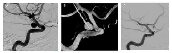 The proven efficacy of flow diverters has led to the expansion of indications for the treatment of complex or even non-complex IAs [82]. At present, flow diverters are indicated for the treatment of small- or medium-sized aneurysms [83,84,85,86,87] and fusiform aneurysms up to the ICA bifurcation, although the last indication remains challenging. Flow diverters can also be used especially in combination with coils in giant aneurysms (Figure 6).