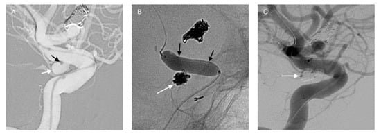 Balloon-assisted coiling of an ICA aneurysm (A, white arrow). The tip of the microcatheter within the aneurysm is seen (A, black arrow). The balloon is inflated in ICA (B, black arrows) while the coils in implanted within the aneurysm (B, white arrow). The successful occlusion of the aneurysm is shown in image (C, white arrow).