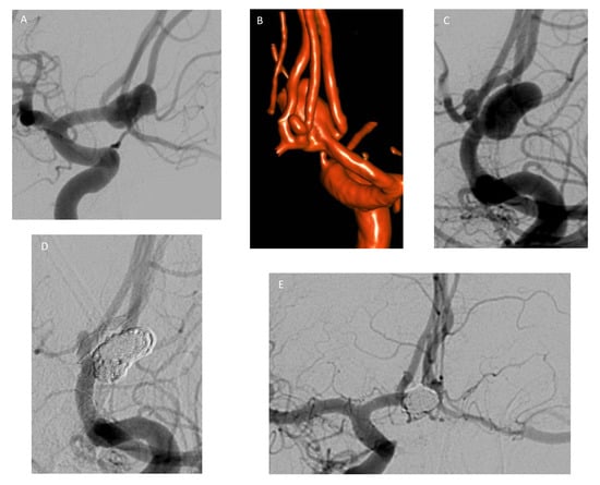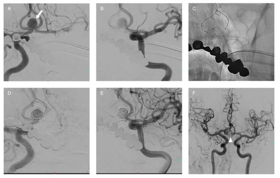 - Hwang, G.; Park, H.; Bang, J.S.; Jin, S.C.; Kim, B.C.; Oh, C.W.; Kang, H.S.; Han, M.H.; Kwon, O.K. Comparison of 2-Year Angiographic Outcomes of Stent- and Nonstent-Assisted Coil Embolization in Unruptured Aneurysms with an Unfavorable Configuration for Coiling. Am. J. Neuroradiol. 2011, 32, 1707–1710. [Google Scholar] [CrossRef] [PubMed]