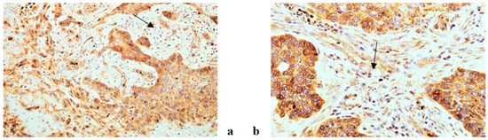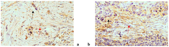 MMP9 antibody, cytoplasmic positivity in cancer (black arrow) and stromal cells (red arrow)of non metastatic OSCC (a) and in metastatic OSCC (b). (magnification 200×).