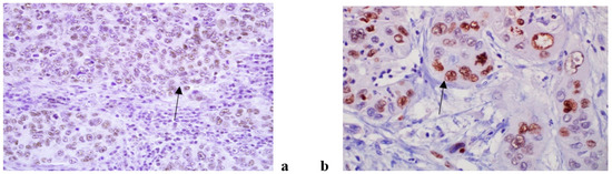 An immunohistochemical analysis of AR, Ki67, VEGF, HF1beta and MMP9 was performed in 187 patients suffering from OSCC (96 non-metastatic and 91 metastatic). The expression of all tested markers was present both in cancer and stromal cells with varying frequency. AR, Ki67 and HF1beta were more strongly expressed in cancer cells than in stroma, VEGF was almost equally expressed in both, while MMP9 was more strongly expressed in stroma than cancer cells. Representative immunohistochemistry characteristics of the studied markers are shown in Figure 1, Figure 2, Figure 3, Figure 4 and Figure 5. The results of the expression of the tested biomarkers in patients suffering from metastatic and non-metastatic OSSC are presented in Table 2. This table also reports the MR comparing the means of each biomarker in metastatic vs. non metastatic patients. As evident, all of the biomarkers significantly differed between non-metastatic and metastatic disease, some positively (MR > 1) others negatively (MR < 1). The expression of all of the tested biomarkers in cancer cells significantly differed between non-metastatic and metastatic disease, except for AR. A significant difference in AR, Ki67 and VEGF expression in cancer stroma between non-metastatic and metastatic disease was found. Due to a higher frequency of positive cells in stroma for VEGF and MMP9, further stratification was performed by scoring positive signals in macrophages and lymphocytes. Significantly more MMP9 positive stromal macrophages were detected in metastatic patients, while lymphocytes showed no significant difference contrary to VEGF for which significantly more positive macrophages were detected in non-metastatic patients.
