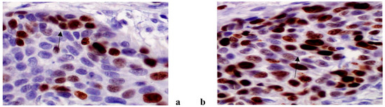 Ki 67 antibody, nuclear positivity in non metastatic OSCC (a) and metastatic OSCC (b). (magnification 400x).