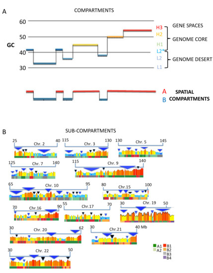 (A) A profile of a chromosome segment in which all isochore families are represented is compared with the corresponding compartment profile to show that, while the L1 and L2− isochores correspond to the B compartment, the other isochores correspond to the A compartments (modified from [6]). (B) The figure shows an average match between isochores/isochore-blocks (profiles) and chromatin sub-compartments (A1–B4). Blue/black triangles are examples of good/bad matches (from a Supplementary Figure of [30]).