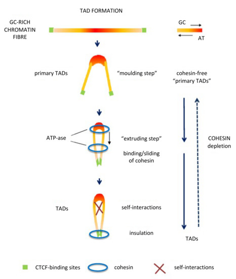 In contrast with the compositionally flat B1–B3 sub-compartments, corresponding to L2− and L1 isochore super families, the A1 and A2 sub-compartments corresponding to L2+, H1–H3 isochores are characterized by sharp peaks. In this case, compositional gradients (involving oligo-G’s, CpG’s and CpG islands) characterized by increasing bendability, increasing accessibility, decreasing supercoiling and decreasing nucleosome density [84], constrain chromatin into loops, the tips of the loops corresponding to the highest GC levels and being the attachment sites for cohesin, while the increasing presence of oligo-A’s in the valleys helps the folding of the chromatin fibre between GC-rich peaks. This initial “moulding step” leads to cohesin-free “primary TADs” [7,8] that may be followed by extrusion through the action of cohesin, the extrusion being stopped by GC-poor DNA-bound CTCF (see Figure 5). At this point, it should be stressed that the results obtained on a DNA basis and those obtained by Hi-C are linked with each other, as expected.