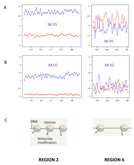 In human chromosome 21, the first, compositionally flat structure is found in regions 2, X and Y. In contrast, the second one comprises the single peaks and the sets of peaks and valleys of regions 1, 3, 4, 5, 6 (see Figure 2A,B; similar situations are present in all human chromosomes; Jabbari, K., Ritucci, M., Bernardi, G., to be submitted). That the two compartments are “spatially arranged in a polarized manner” in chromosomes was also independently shown by Wang et al. (2016) [80]. Figure 2C shows that the two “super-families” of isochores correspond to the “spatial compartments”, as expected from the comparison of Figure 1C.
