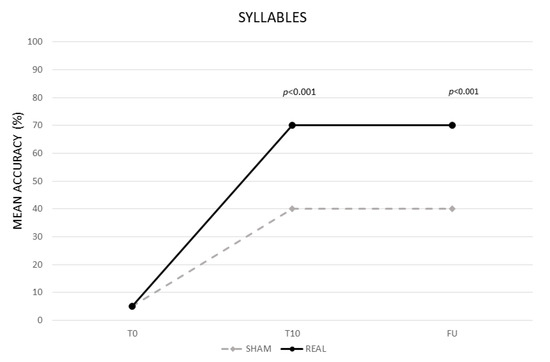 The analysis showed a significant effect of CONDITION (real vs. sham, F (1,13) = 83,27, p < 0.001) and TIME (baseline (T0) vs. end of treatment (T10) vs. follow-up (F/U), F (2,26) = 353,78, p < 0.001). The interaction TIME × CONDITION was also significant (F (2,26) = 88,65, p < 0.001). The Bonferroni’s post hoc test revealed that, while no significant differences emerged in the mean percentage of correct syllables between the two conditions at T0 (real 5% vs. sham 5% p = 1), the mean percentage of accuracy was significantly greater in the real than in the sham condition at T10 (real 70% vs. sham 40%, p < 0.001) and persisted at F/U (real 70% vs. sham 40% p < 0.001). Significant differences also emerged between T0 and T10 for the sham condition (35%, p < 0.001) (see Figure 1).