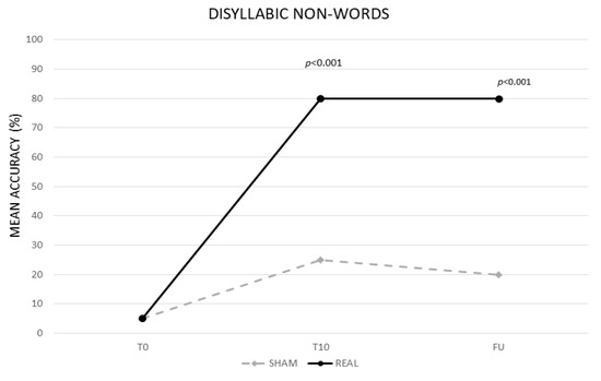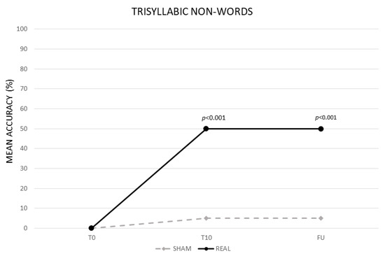 The analysis showed a significant effect of CONDITION (real vs. sham, F (1,13) = 408.82, p < 0.001) and TIME (baseline (T0) vs. end of treatment (T10) vs. follow-up (F/U), F (2,26) = 477.66, p < 0.001). The interaction TIME × CONDITION was also significant (F (2,26) = 386.56, p < 0.001). The Bonferroni’s post hoc test revealed that, while no significant differences emerged in the mean percentage of correct syllables between the two conditions at T0 (real 0% vs. sham 0%, p = 1), the mean percentage of accuracy was significantly greater in the real than in the sham condition at T10 (real 50% vs. sham 5%, p ≤ 0.001) and persisted at F/U (real 50% vs. sham 5% p < 0.001). No significant differences emerged between T0 and T10 for the sham condition (0%, p = 1) (see Figure 3).